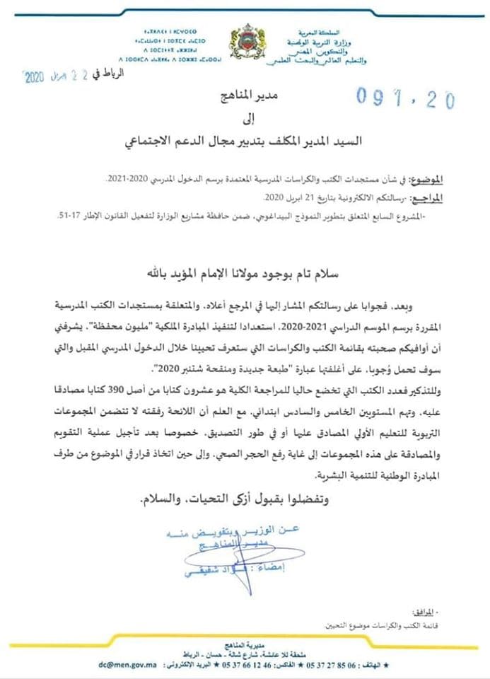 مراسلة وزارية 20 كتاب مدرسي جديد برسم الدخول المدرسي 2020 2021